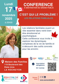 L’association ESMERALDA organise son 4ème événement Franco/Canadien avec la nouvelle venue sur notre territoire, de Mme Hébert Ariane, psychologue clinicienne Québécoise. Elle sera présente du lundi 17 au jeudi 20 novembre inclus avec plusieurs conférences sur les relations familiales et l’opposition. Mais elle traitera également lors d’une conférence le jeudi soir, sur la cohabitation entre le TSA et le TDAH.