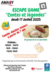 Dans le cadre de l’espace jeux du 16 juillet au 24 juillet (matin de la maison de quartier des forges, nous vous accueillons autour d’un temps fort "escape Game contes et légendes" animé par l’association "animons jeux".