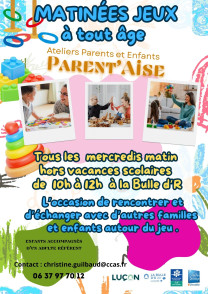 Tous les mercredis matin hors vacances scolaires entre 10h et 12h, des jeux sont à disposition des familles dans une salle de la Bulle d’R et les familles peuvent aussi amener des jeux à partager avec d’autres familles et enfants.