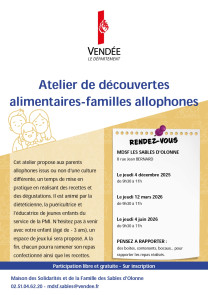 Cet atelier propose aux parents allophones issus ou non d’une culture différente, un temps de mise en pratique en réalisant des recettes et des dégustations. Il est animé par la diététicienne, la puéricultrice et l’éducatrice de jeunes enfants du service de la PMI. N’hésitez pas à venir avec votre enfant (âgé de - 3 ans), un espace de jeux lui sera proposé. A la fin, chacun pourra ramener son repas confectionné ainsi que les recettes.