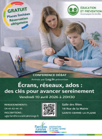 Temps d’écran, cyberharcèlement, jeux en ligne, intelligence artificielle : l’association Familles Rurales organise une conférence le vendredi 10 avril 2026 à Sainte Gemme la Plaine pour s’informer, échanger et répondre à vos questions.