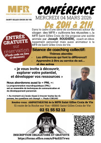 Une conférence aura lieu le MERCREDI 04 MARS 2026 à la MFR de SGXV à 20h et sera de nouveau animée par Joseph ROUDIERE, coach de vie et animateur à la MFR. Joseph revient, le temps d’une séance de coaching collectif, pour aborder le vaste thème du développement personnel.
