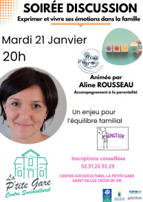 Soirée discussion animée par Aline Rousseau.Gratuit.Inscriptions conseillées.Exprimer et vivre ses émotions , un enjeu pour l’équilibre familial.