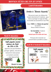 - 23/12/2024 : sortie à "Lumin Essarts" de 18h15 à 20h30 accessible en poussette - gratuit pour les moins de 6ans et 6€ pour les +6ans - sur inscription